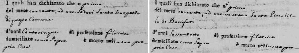 La prima a morire fu la più anziana di età. Si chiamava Santa Scarpelli ed era vissuta cento e cinque anni, stando a quanto dichiarato nell'atto di morte. Poiché a dichiararne il decesso furono Arcangelo Rimedio e Bruno Oliva, due vicini di casa, e a confermarla fu il sindaco del tempo, l'avvocato Emmanuele Conti, dobbiamo supporre che un computo così avanzato degli anni risultasse da qualche documento. La Santa minore, di età si intende, era una filatrice di quasi settanta anni che rispondeva al nome di Santa Piccolillo. Nell'atto i due dichiaranti, i foresi Serafino Paletta e Bartolo Cipolla, conoscenti e vicini della defunta, dichiararono che la morta aveva sessantotto anni ed era nata a Bonifati. Di Santa Scarpelli non sappiamo nulla, ma, considerato che il cognome è presente a San Marco con un unico ceppo familiare, ritengo che fosse un'antenata dei vari Scarpelli tuttora presenti a San Marco Argentano e dei tanti oriundi sparsi nel mondo. L'eccezionale longevità della Santa morta il primo dicembre del 1818 al Casalicchio non trova, almeno nell'Ottocento, una rispondenza in altri componenti di questo ceppo familiare, visto che non vi furono altri centenari e che, all'epoca, furono documentate solo otto persone con lo stesso cognome che superarono la metà degli anni della Santa! Potremmo dire che la benedetta Santa fu davvero un'eccezione. O un'esagerazione di quanti la conobbero, visto che il più delle volte l'età dei defunti era calcolata ad occhio e croce, un metodo utilizzato proprio dalle filatrici, come lo era stata in vita la Santa Scarpelli, che univano i fili della trama che si rompevano, riannodandoli laddove capitava. Il riferimento a Cloto, Lachesi e Atropo, le tre divinità che avevano il compito di reggere il filo della vita dei mortali, tessendolo, misurandolo e tagliandolo, diventa talmente naturale che viene da credere in una temporanea distrazione dell'ultima, intenta in altre faccende. Per chi ci crede, ovviamente, mentre più banalmente dobbiamo pensare che, sempre ammesso che l'età della vegliarda filatrice fosse quella reale, qualcuno avesse riportato una 'voce' che la voleva nata nello stesso anno in cui a Natale il duca di Savoia, Vittorio Emanuele II, fu incoronato re di Sicilia. Tutto è possibile e se qualcuno credesse che Santa Scarpelli fosse stata un'eccezione si sbaglia, perché fu superata di un ulteriore decennio nel 1903 da una contadina nata a Bonvicino e morta a San Marco, in contrada Rupi, all'età di cento e quindici anni! Di lei ho scritto la storia che potete leggere alla pagina dedicata a nonna Francesca nelle genealogie sammarchesi in questo stesso sito. Dell'altra Santa, il cognome Piccolillo farebbe supporre un'appartenenza all'unico ceppo presente con tale cognome a San Marco, anche se il comune di nascita, Bonifati, non è lo stesso da cui provenivano i capostipiti di esso. L'origine dei Piccolillo risulta essere dagli atti la frazione Sant'Angelo di Cetraro, ma non è esclusa un'origine diversa all'epoca in cui nacque Santa Piccolillo. Il quartiere del Critè, in cui fu registrata la sua morte corrisponde a quello altrimenti detto Capo delle Rose, in cui abitarono individui con lo stesso cognome. San Marco Argentano, 1° dicembre 2025 Paolo Chiaselotti |